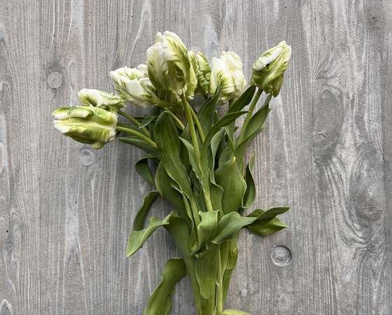 少し縮れた白い花弁に緑色の模様が入った少し変わったチューリップです。ボリュームもインパクトも抜群です!
