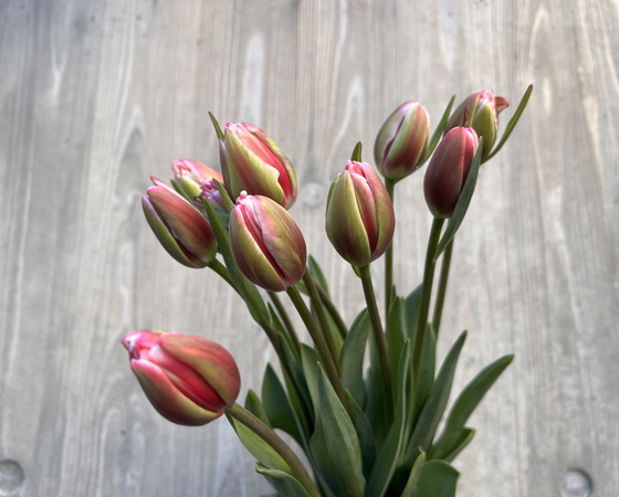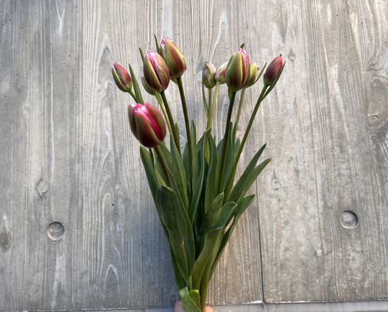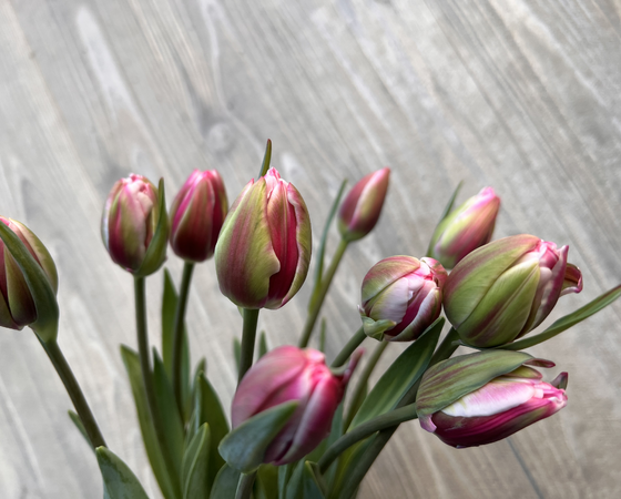 八重咲きの品種となっており、花色は濃いピンク色に縁が白の複色でとても可愛らしいです。
