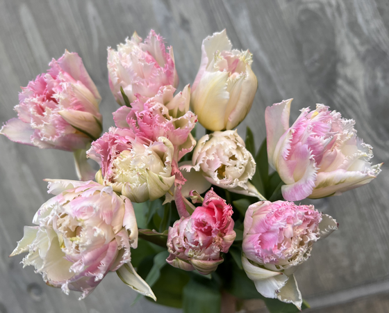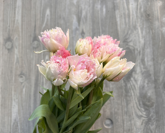 開花が進むことで花色は白から綺麗なピンク色へと変わり、チューリップには珍しい芳香性のある八重フリンジ咲きの品種となっております。