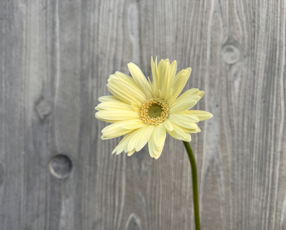 淡い黄色の花色が春らしく優しい印象のガーベラとなっております。