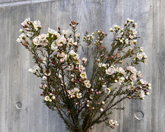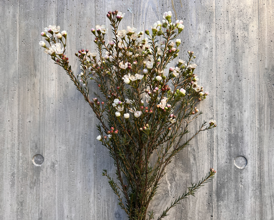 蝋細工のような質感の花が特徴的で、花色は白にうっすらとピンクが入っておりとても可愛らしい花となっております。