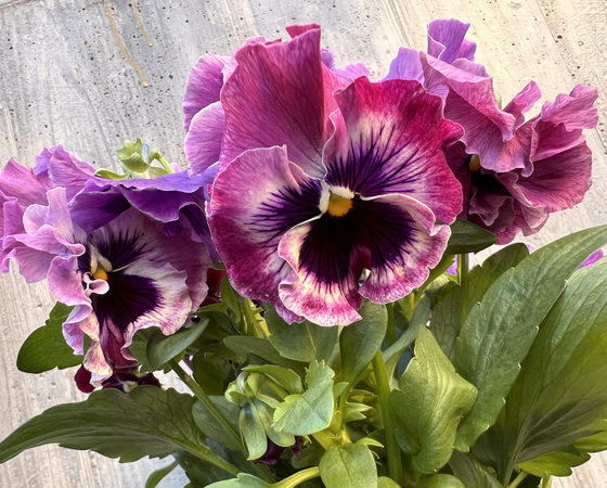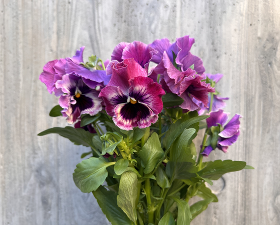 花のサイズは中輪で、花弁にフリルがかかっていてとても可愛らしくも高貴な印象のパンジーです。