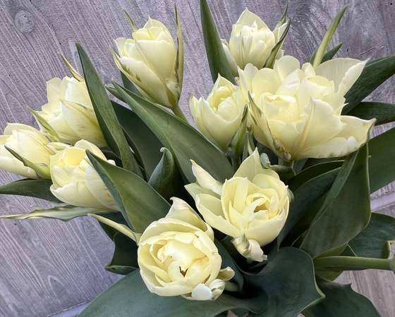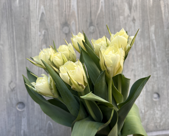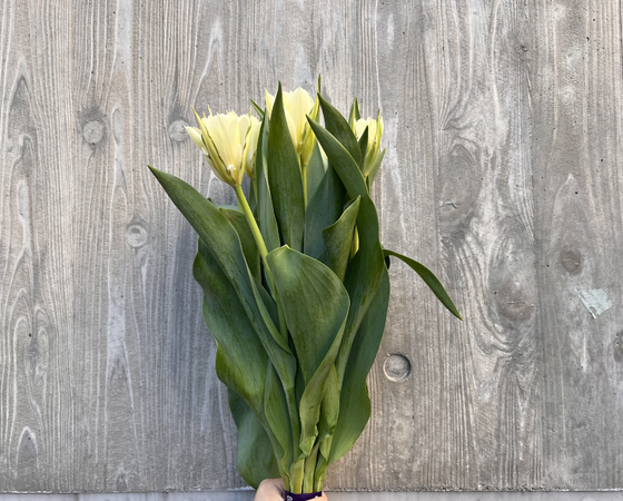 八重咲きの品種で、淡いクリーム色に緑のラインが入ったチューリップとなっております。