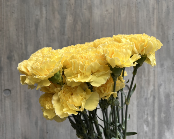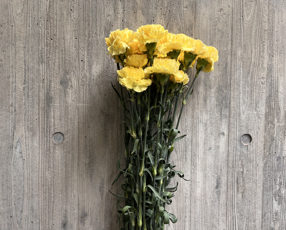 一輪タイプのカーネーションで、花色は少しオレンジっぽい優しい黄色となっております。